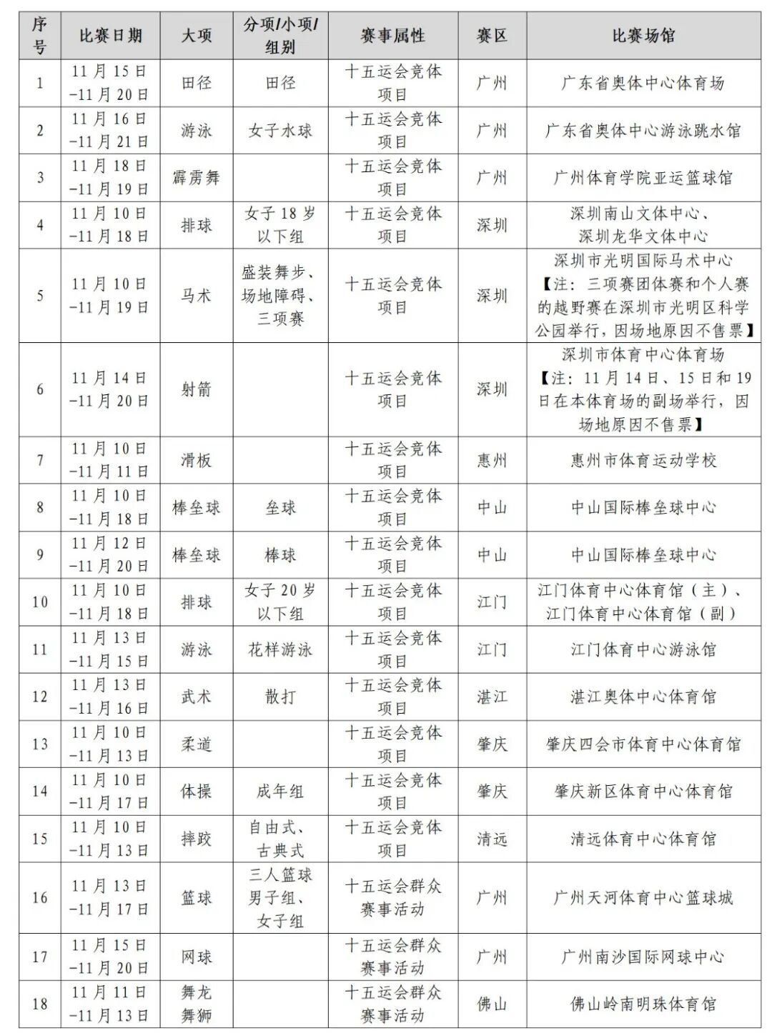 本批次开售的18个体育项目,既包括专业竞技赛事,也纳入了群众参与的高水平赛事活动。赛事将在广东赛区的广州、深圳、佛山、惠州、中山、江门、湛江、肇庆、清远9个城市举办。