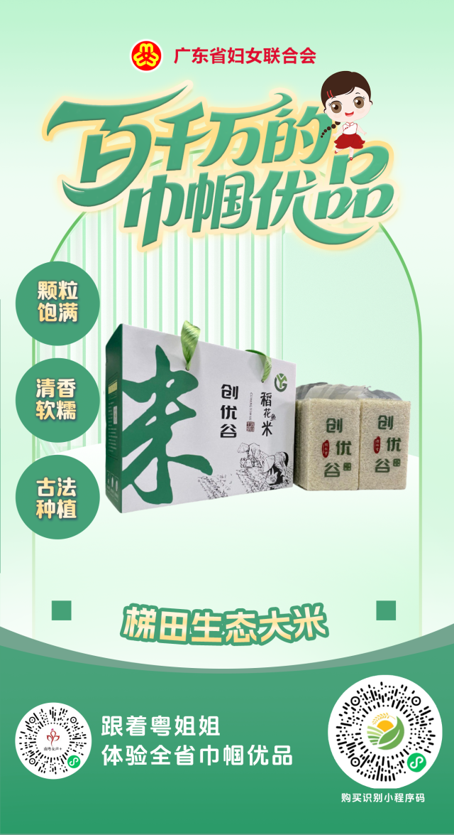 梯田生态大米产自阳江大八层层梯田,坚持天然古法种植,全程杜绝农药化肥,颗粒饱满、清香软糯,适于饭食粥羹,基地获评广东省生态农场、阳江市巾帼创业基地。识别下图右侧小程序码即可购买。