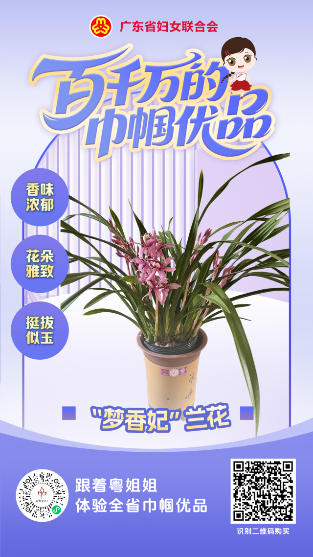 “梦香妃”兰花花朵呈雅致紫粉色,香味浓郁持久,叶片油亮如缎、花茎挺拔似玉,品相出众,通过电商平台畅销全国,是兼具观赏与馈赠价值的精品兰花。识别下图右侧二维码即可购买。