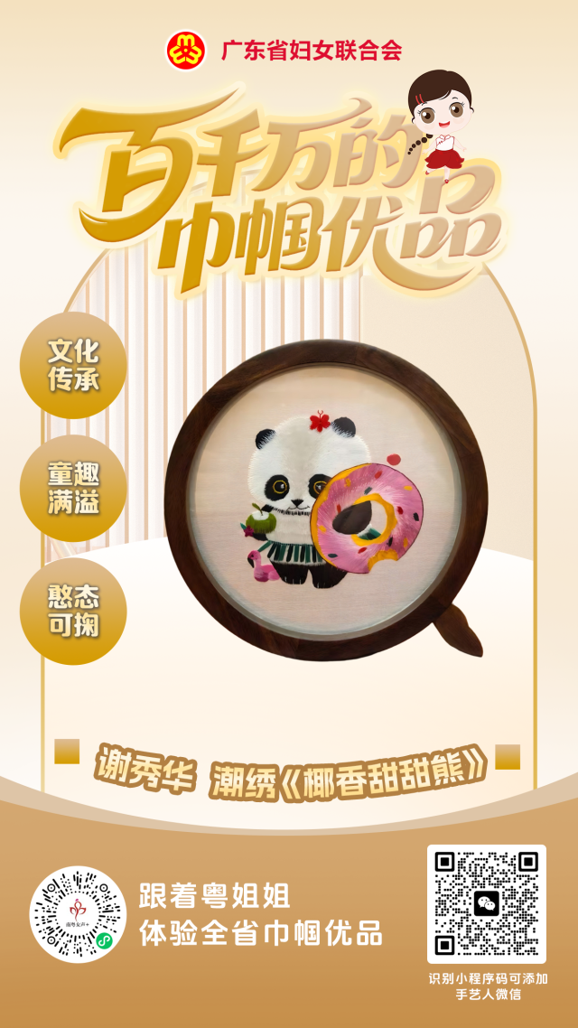 这款潮绣作品以国宝熊猫为灵感,细腻丝线勾勒出怀抱甜甜圈与椰子的憨萌形象,糖霜彩斑与椰纹生动鲜活,绿裙粉鸟点缀童趣。实木圆框融合传统刺绣雅致与萌趣设计,成为案头治愈系装饰。识别下图右侧二维码即可添加手艺人微信。