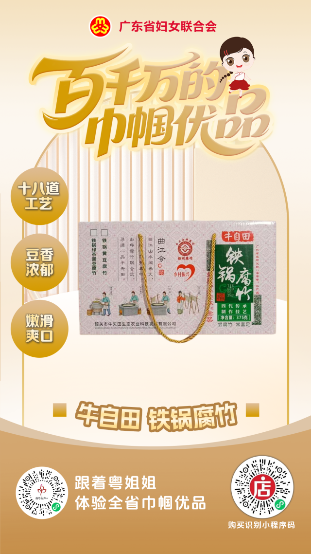 由坪腐竹的制作技艺已经有一百四十多年历史,“磨豆腐”“捻腐竹”的技术得以世代相传。牛自田铁锅腐竹秉承百年传统技艺,以铁锅煮浆、人工“捻”制为核心,历经十八道工序精制而成,成品色泽光亮、豆香浓郁且嫩滑爽口。获“粤字号”农产品称号,并入选韶关市非物质文化遗产名录。识别下图右侧二维码即可进入官方小店购买。