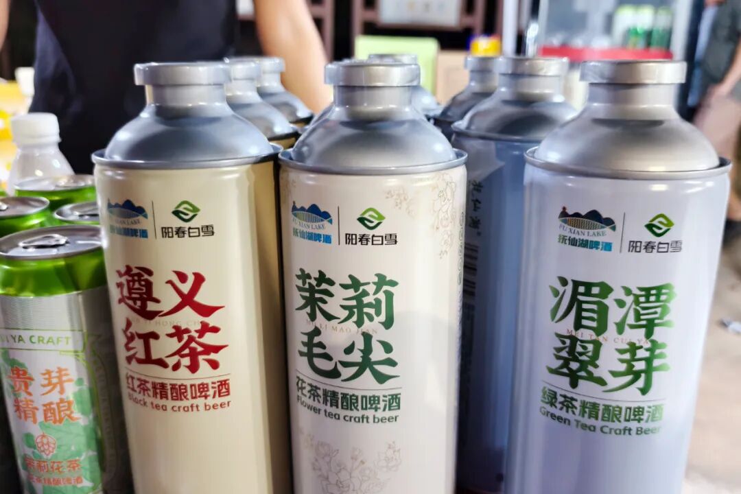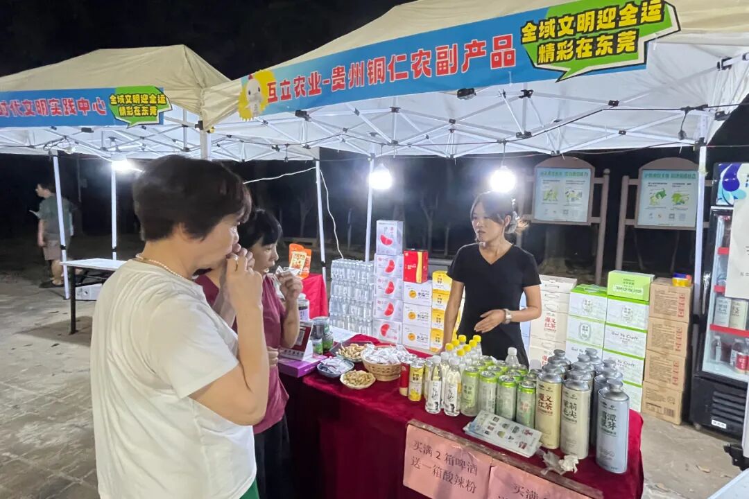 贵州铜仁与常平曲江对口帮扶农副产品摊位陈列着马坝油粘米、罗坑茶、火山粉葛制品、淮山面、莲藕面等特色农产品,吸引众多市民游客前来选购。现场工作人员也借助啤酒嘉年华的人流热度,通过派发文旅宣传手册、介绍景点特色等方式,向市民推介曲江精品旅游线路和特色文化产品,实现“农产品+文旅”双推广。