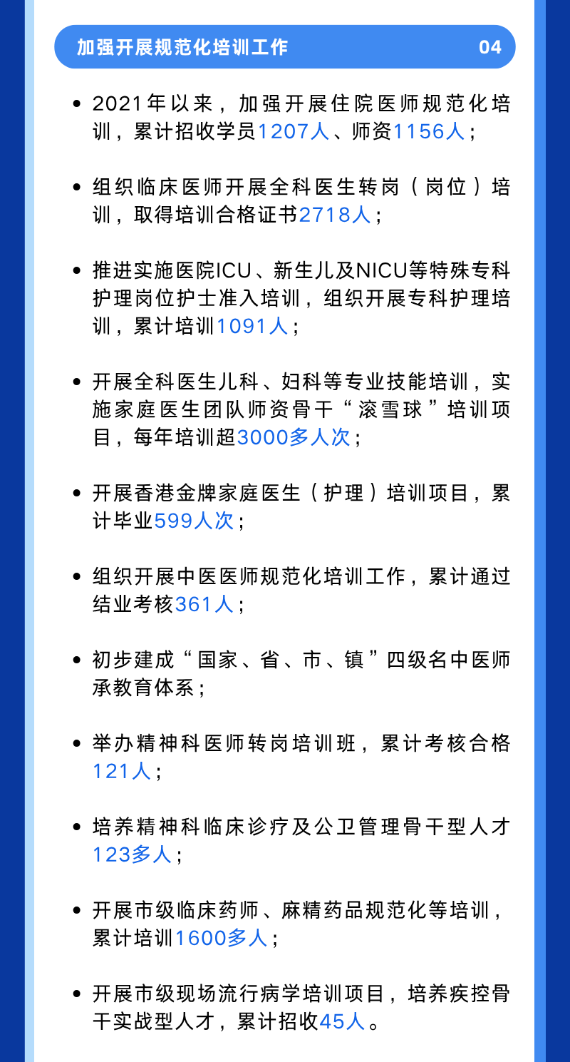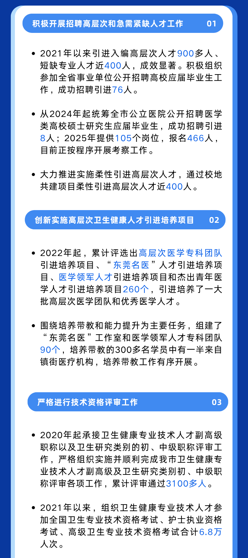在新一轮人才政策体系的统一架构下,市卫生健康局把原来的高层次卫生健康人才引进培养项目整体融入“1+6”人才政策体系当中,印发了《东莞市“引才领航”高层次医学专科团队项目实施方案》和《东莞市“育才启航”卫生健康人才培养带教项目实施方案》,正式启动实施卫生健康人才“双航”项目,持续引进高层次医学专科团队,坚持加大青年技术骨干培育力度,进一步提升我市医学专业领域技术水平和服务能力,不断加强后备人才队伍建设。