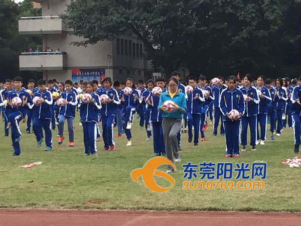 东莞阳光网讯 11月25日下午,中堂中学迎来了全市大课间评比。记者在现场看到,一千多名初中同学迎着灿烂的阳光,伴着足球操音乐,迅速整齐有序地排着队伍,跑到指定位置,开始展示富有中堂中学特色的足球操。