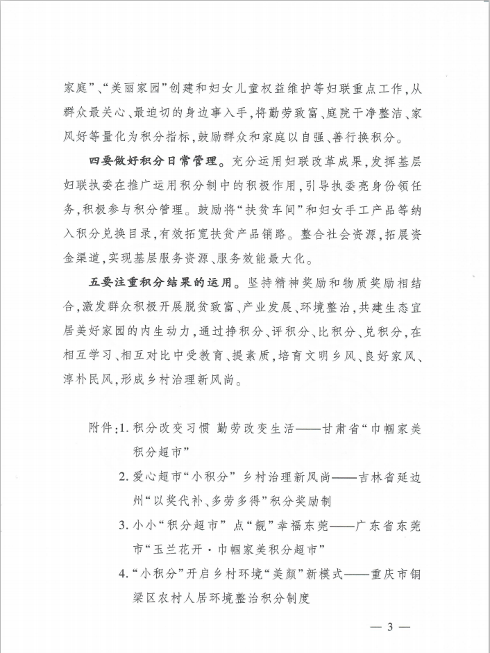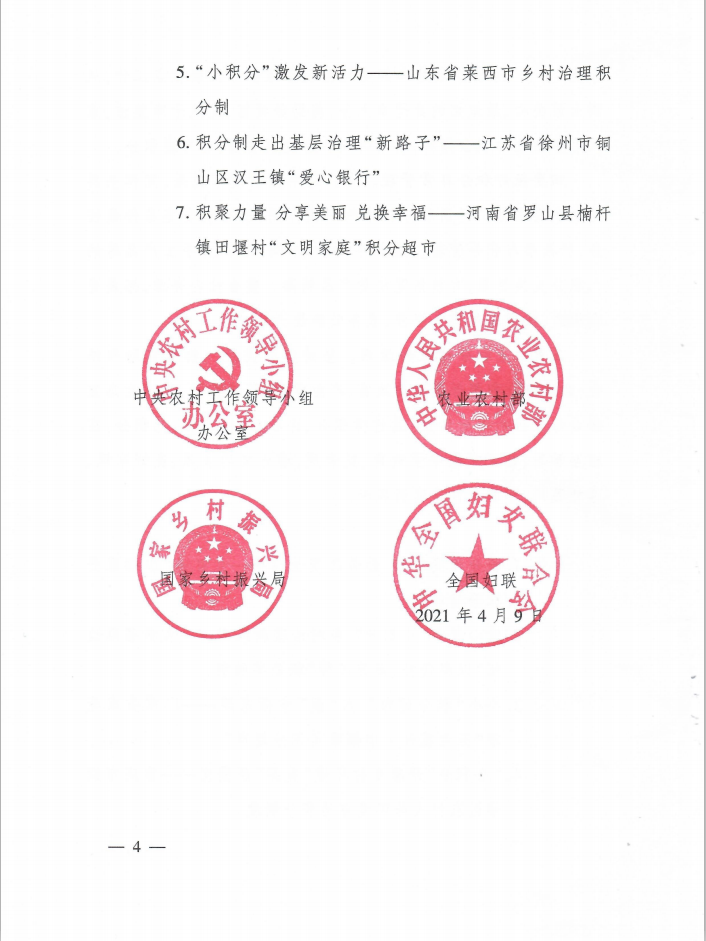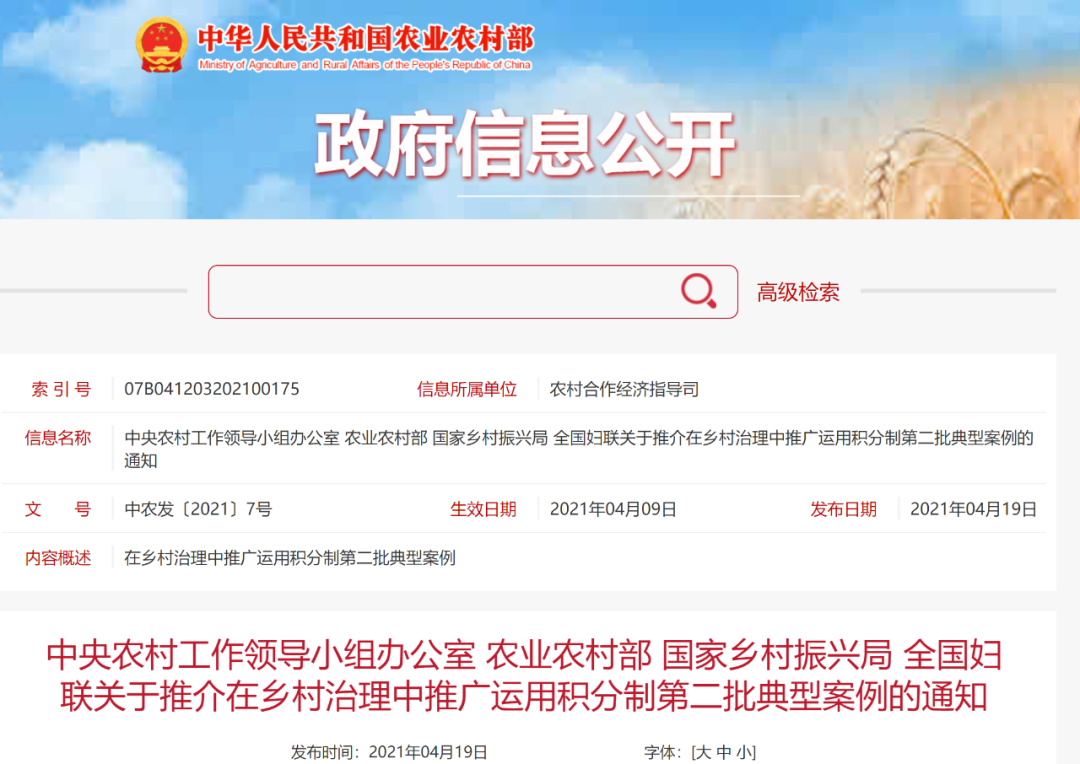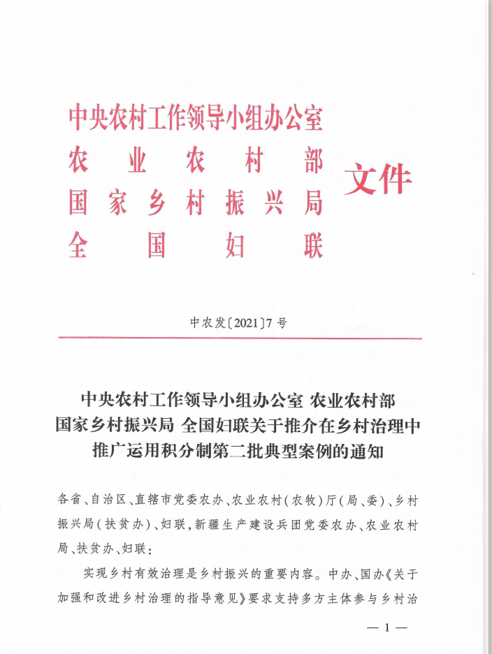中央农村工作领导小组办公室、农业农村部、国家乡村振兴局、全国妇联四部门联合发布《关于推介在乡村治理中推广运用积分制第二批典型案例的通知》(中农发〔2021〕7号)文件中指出,实现乡村有效治理是乡村振兴的重要内容。中办、国办《关于加强和改进乡村治理的指导意见》要求支持多方主体参与乡村治理,充分发挥妇联等组织联系群众、团结群众、组织群众参与民主管理和民主监督的作用。2020年,中央农办、农业农村部印发《关于在乡村治理中推广运用积分制有关工作的通知》。为鼓励妇联组织更加充分发挥作用,中央农办、农业农村部、国家乡村振兴局、全国妇联联合遴选的7个典型案例,供各地学习借鉴。