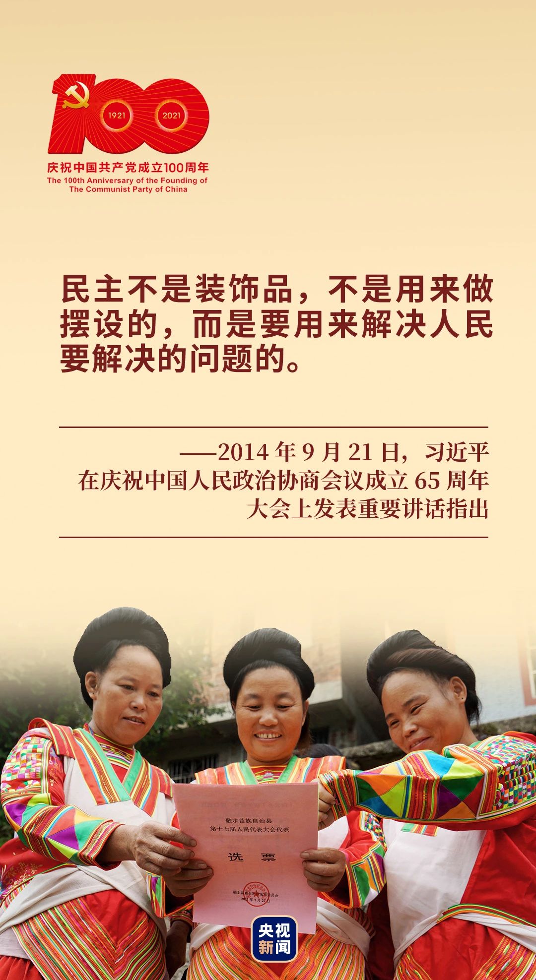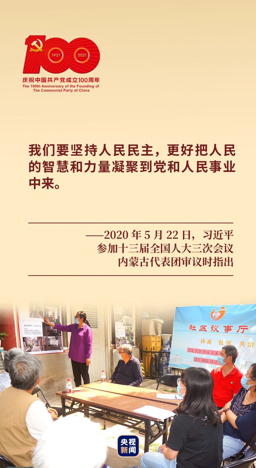 2021年7月1日,习近平总书记在庆祝中国共产党成立100周年大会上发表重要讲话指出,“践行以人民为中心的发展思想,发展全过程人民民主。”