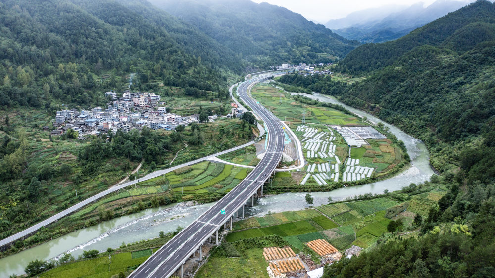 车辆行驶在秀印高速公路木黄至梵净山路段(8月15日摄,无人机照片)。新华社记者 陶亮 摄