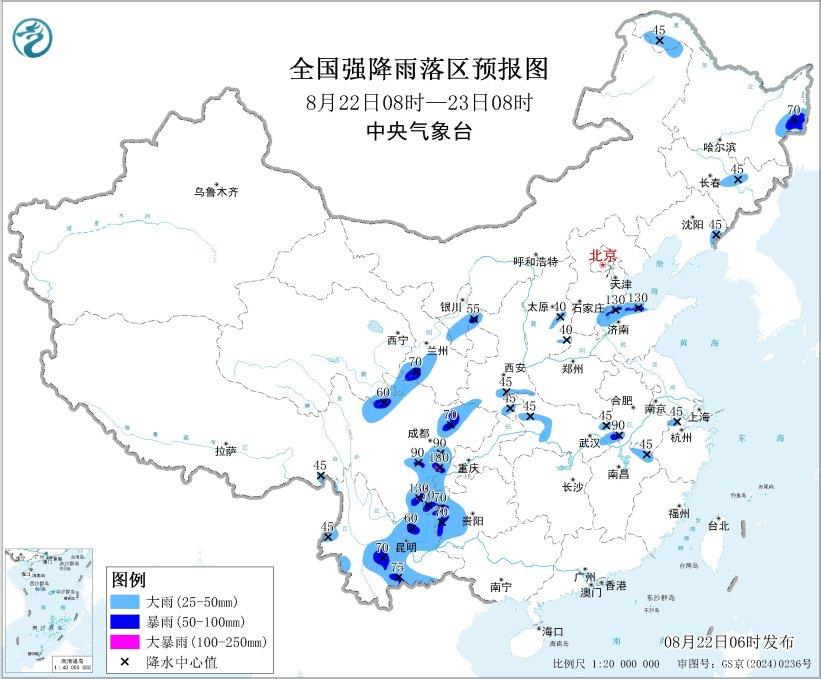 预计,8月22日8时至23日8时,黑龙江西北部和东部、吉林中部、辽宁东部、青海东南部、甘肃中南部、宁夏中部、陕西南部、山西东部、山东北部、湖北东部和西部、江西北部、川西高原北部、四川盆地中西部和南部、贵州西部、云南中东部和西南部等地部分地区有大到暴雨,其中,山东北部、四川盆地南部、云南东北部等地局地有大暴雨(100~180毫米)。上述部分地区伴有短时强降水(最大小时降雨量20~50毫米,局地可超过70毫米),局地有雷暴大风等强对流天气。