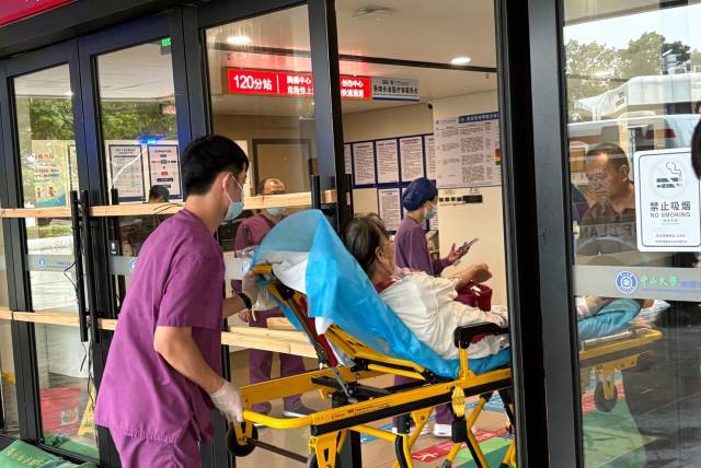 24日10时52分,救护车的鸣笛声划破上空,医护人员一路小跑将突发中风的吴奶奶推进中山大学附属第五医院的急诊室。