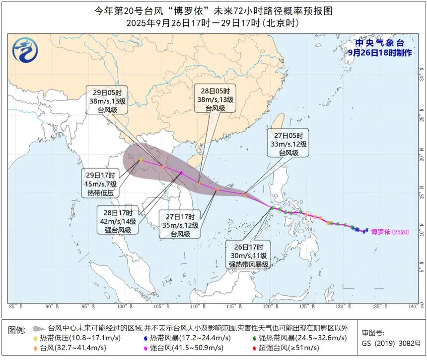 据@中央气象台,9月26日20时,“博罗依”中心距离海南省三沙市(西沙永兴岛)东偏南方向约860公里,中心附近最大风力有11级(30米/秒,强热带风暴级)。预计,“博罗依”将以每小时35~40公里的速度向西偏北方向快速移动,强度逐渐加强。