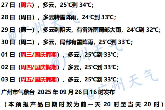 广州市气象台预计,受副热带高压控制,9月27日广州以多云为主,白天体感闷热。9月28日—29日受“博罗依”外围环流影响,广州雷雨增多,局部雨势较大并伴有8级左右短时大风。
