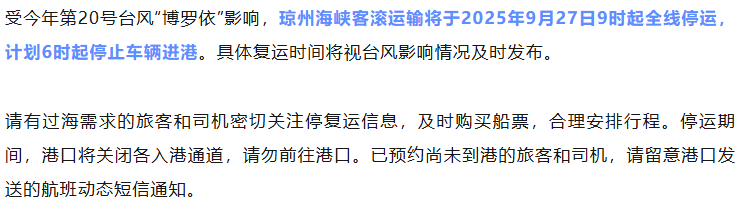 据广东交通消息,受台风“博罗依”影响,琼州海峡客滚运输将于27日9时全线停运。
