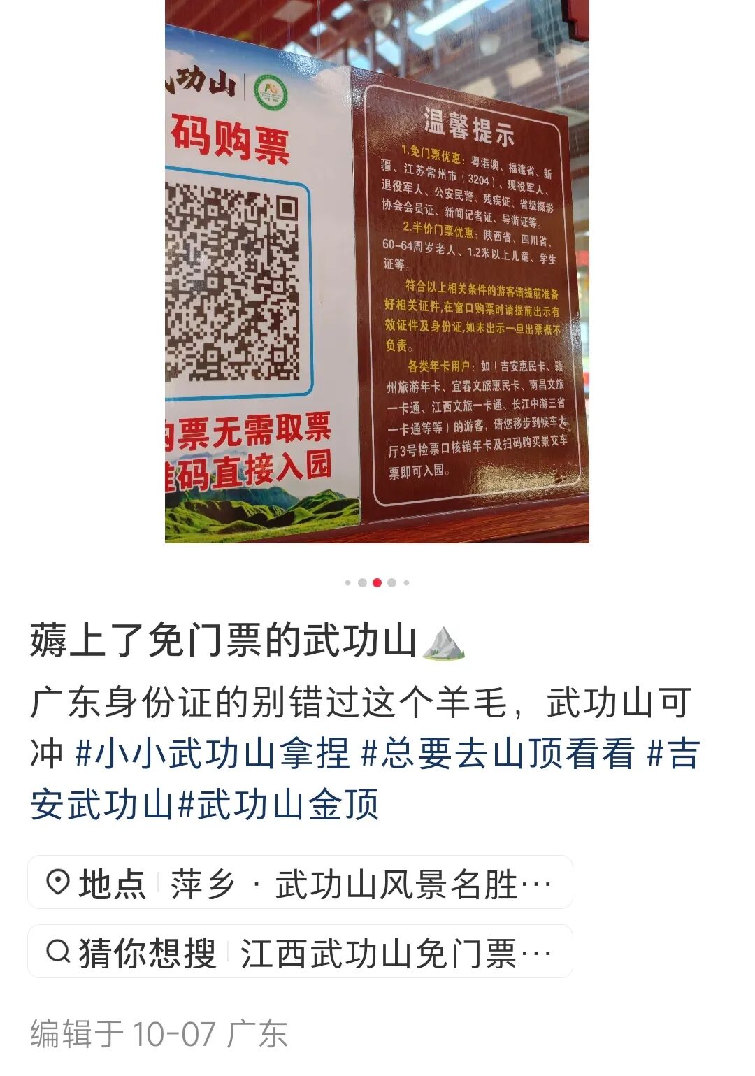 比如,在今年9月,江西安福(广州)文旅产业招商推介会在广州市举办,吸引文旅界人士参与,推介会为粤港澳户籍游客带来专属福利,粤港澳户籍游客凭本人身份证可在吉安武功山景区享受免景区门票优惠(不含索道、观光车)。(该旅游优惠政策将持续至2025年底。)