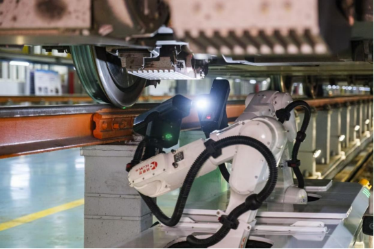 目前,广州动车段共配备了7台动车组检修机器人,全面推行“人机交检”作业模式。其中广州南动车所配置了4台车底检测机器人,机器人检查项点高达1.8万余项,搭载3D图像识别技术,率先在全路采用彩色4K相机,有效提升了对齿轮箱油污、水迹等问题的识别精准度,也为人工复核故障提供了清晰依据。“车底检修机器人的应用既保证了检查质量,也提高了作业效率。”操作人员高尚胤雄说道。