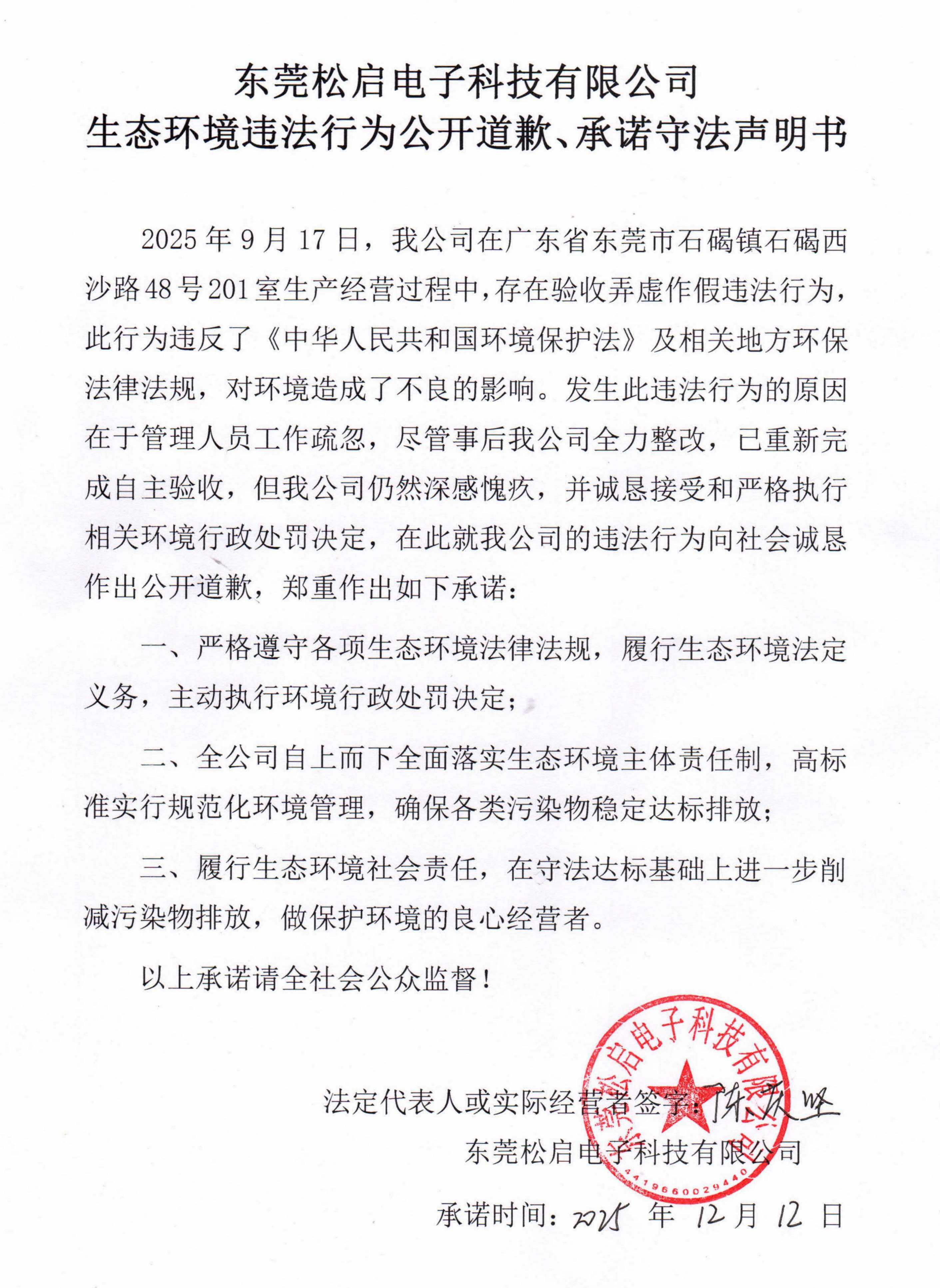 东莞松启电子科技有限公司生态环境违法行为公开道歉、承诺守法声明书