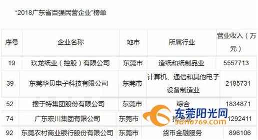 东莞阳光网讯 今天(11月20日),省工商联发发布了“2018广东省百强民营企业”榜单。东莞有5家企业上榜,分别为玖龙纸业(控股)有限公司、东莞华贝电子科技有限公司、搜于特集团股份有限公司、广东宏川集团有限公司和东莞农村商业银行股份有限公司。