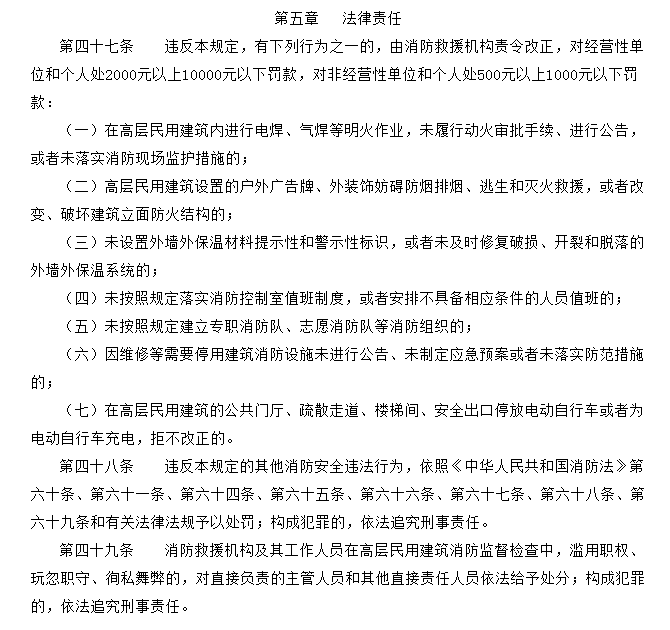 同时,《高层民用建筑消防安全管理规定》还提到,违反本《规定》,有下列行为之一的,由消防救援机构责令改正,对经营性单位和个人处2000元以上10000元以下罚款,对非经营性单位和个人处500元以上1000元以下罚款: