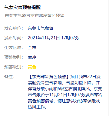 东莞市气象台今天17时07分发布寒冷黄色预警,预计22日凌晨开始,东莞受冷空气影响,气温将明显下降,并伴有分散小雨和6级左右偏北阵风,市民要注意做好防寒保暖及防风工作。