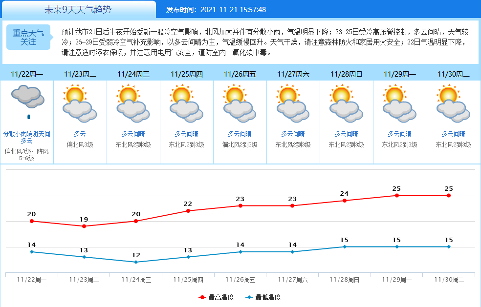 东莞将从21日后半夜开始受新一股冷空气影响,北风加大并伴有分散小雨,气温明显下降;23-25日受冷高压脊控制,多云间晴,天气较冷;26-29日受弱冷空气补充影响,以多云间晴为主,气温缓慢回升。天气干燥,请注意森林防火和家居用火安全。