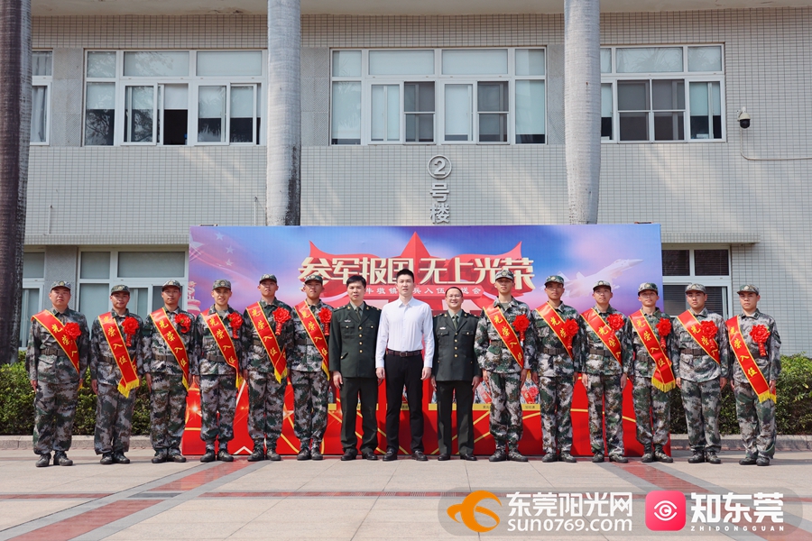欢送会前,望牛墩镇委副书记、镇长梁志豪,镇委委员王永球,镇武装部相关负责人与12名新兵合影。
