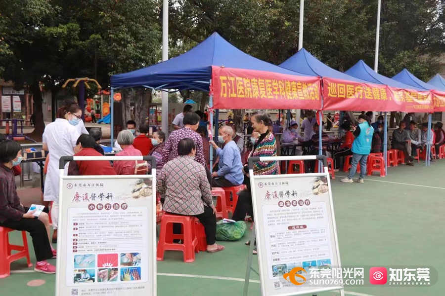 在大汾社区文化广场,万江医院康复医学科医师团队现场为社区居民提供推拿按摩、穴位针灸、拔火罐、艾灸等中医理疗项目,并提供免费问诊、中医把脉、量血压、测血糖等医疗服务。