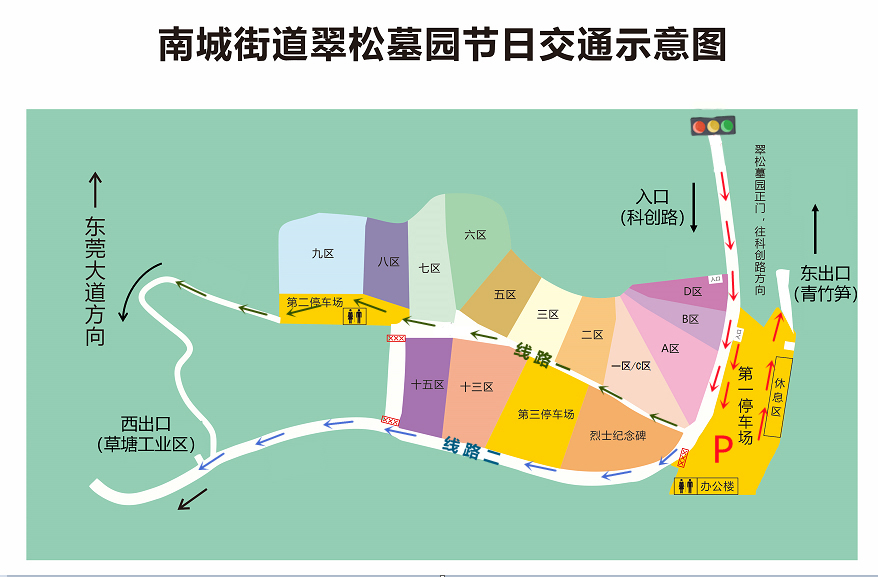 四、服从指挥调度。墓园实行单向行驶,入口位于科创路,出口分别位于草塘工业区(西出口)、青竹笋小组(东出口),市民要自觉服从交通管理和墓园管理处现场工作人员的指挥调度,按车道行驶、停放,切勿逆行、堵塞道路;同时,听从墓园管理人员的有关管理安排,积极简化祭扫流程,压缩祭扫时间,做文明祭扫、安全祭扫的倡导者和践行者。