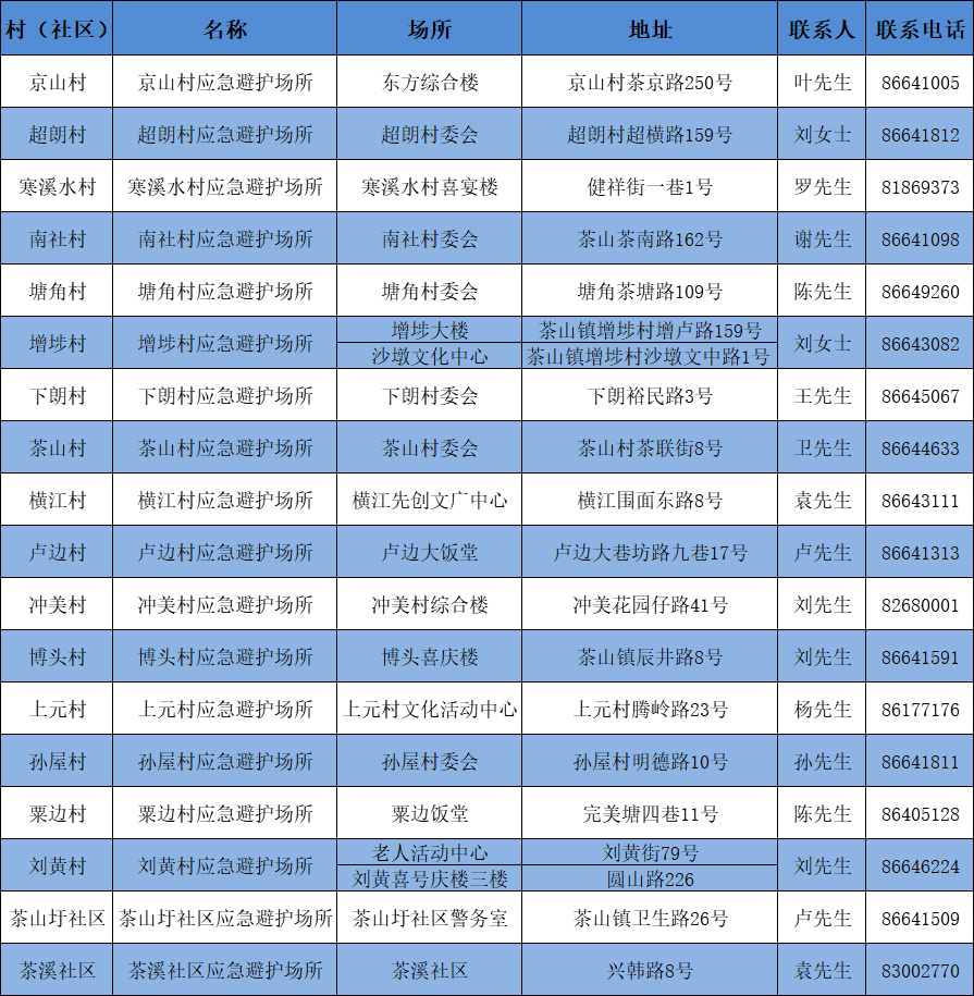 目前,茶山镇18个村(社区)的应急避护场所已开放,24小时为有需要的市民提供帮助,有需要的群众可以前往。