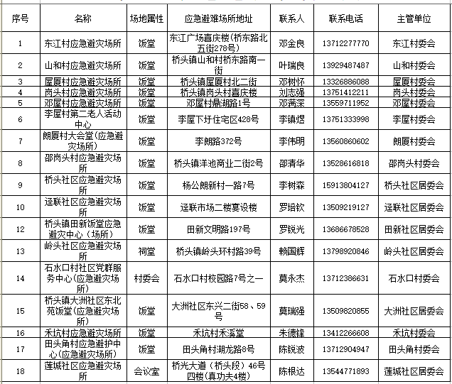从即日起,桥头镇开放应急避难场所,为环卫工人、高龄老人、幼龄儿童等困难人员和有需要的人士提供临时避护救助。请各有关部门和各村(居)继续加强值班值守,密切关注天气变化,做好台风防御工作。