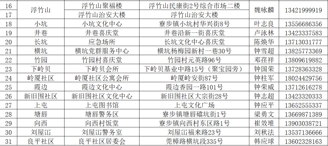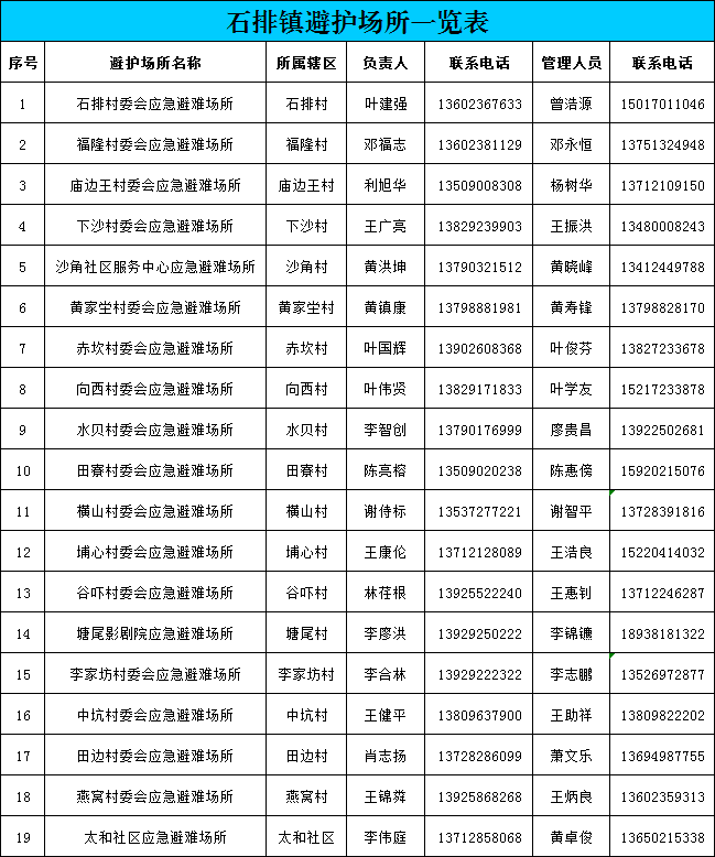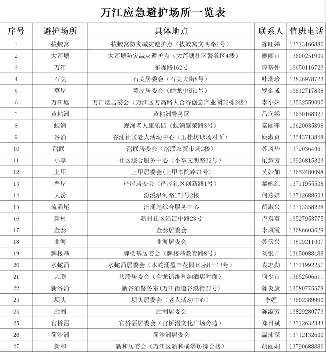目前,万江街道的27个避护场所已全面开放,为有需要暂住的群众提供基本的防风和休息保障。需要暂住的群众,可就近到以下避护场所寻求帮助。