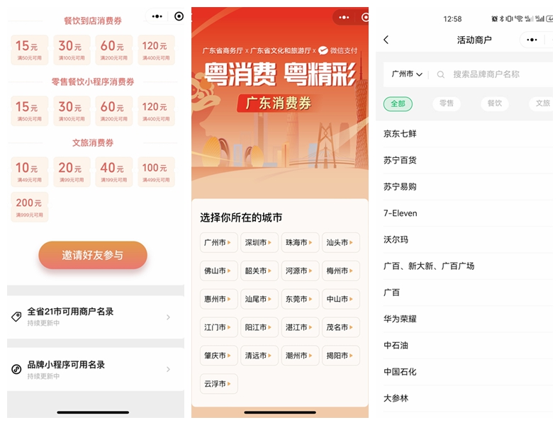 在核销方面,消费者可通过“广东消费券”微信小程序,点击“全省21市可用商户名录”或“品牌小程序可用名录”,选择你所在的城市,搜索、查看参与此次活动的所有商户。