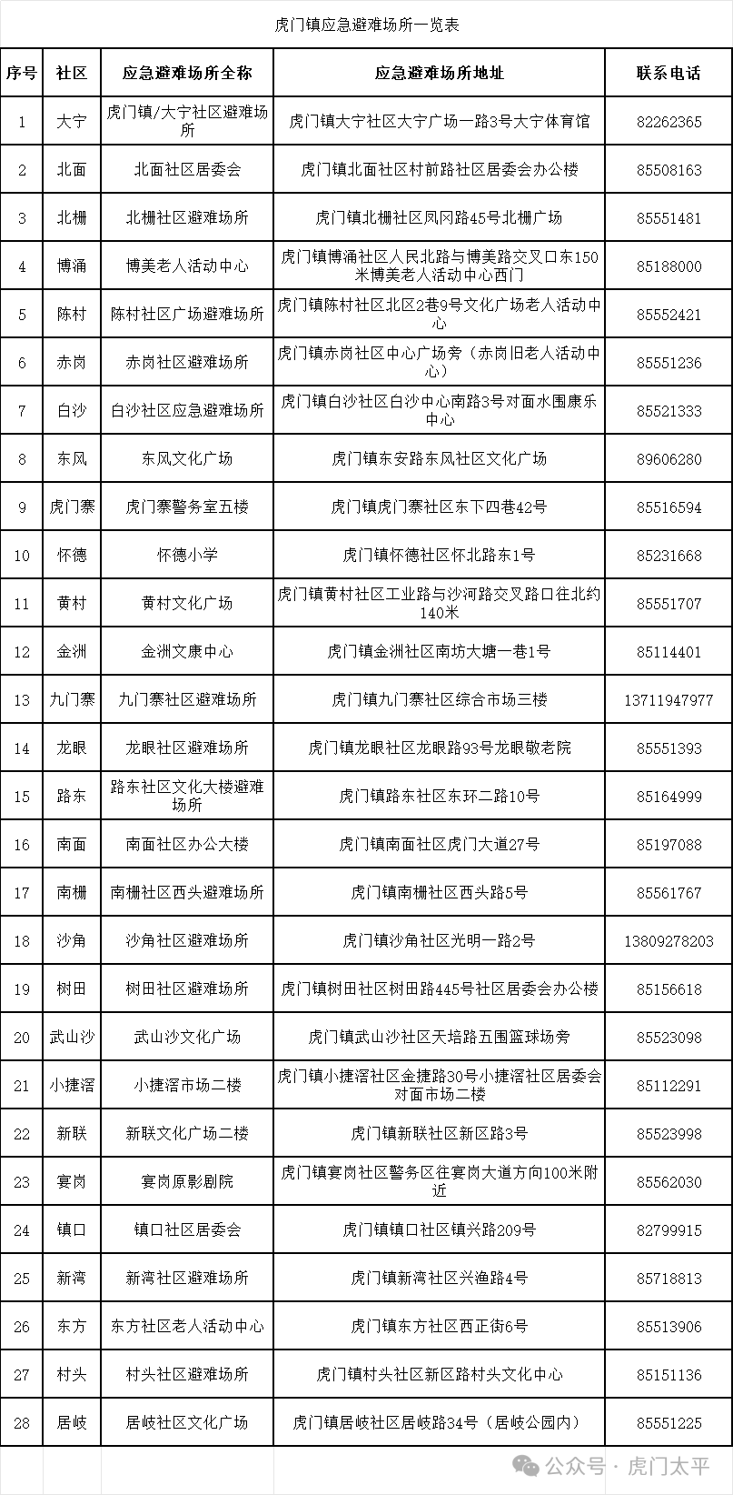 为切实保障人民群众生命财产安全,及时为危险区域群众提供应急避护,虎门镇减灾委员会决定同时启用镇内28个应急避难场所,为有需要的困难群众提供24小时应急避护。虎门镇呼吁广大群众积极协助、支持救助,共同帮助有需要的人员到就近的救助点接受救助。