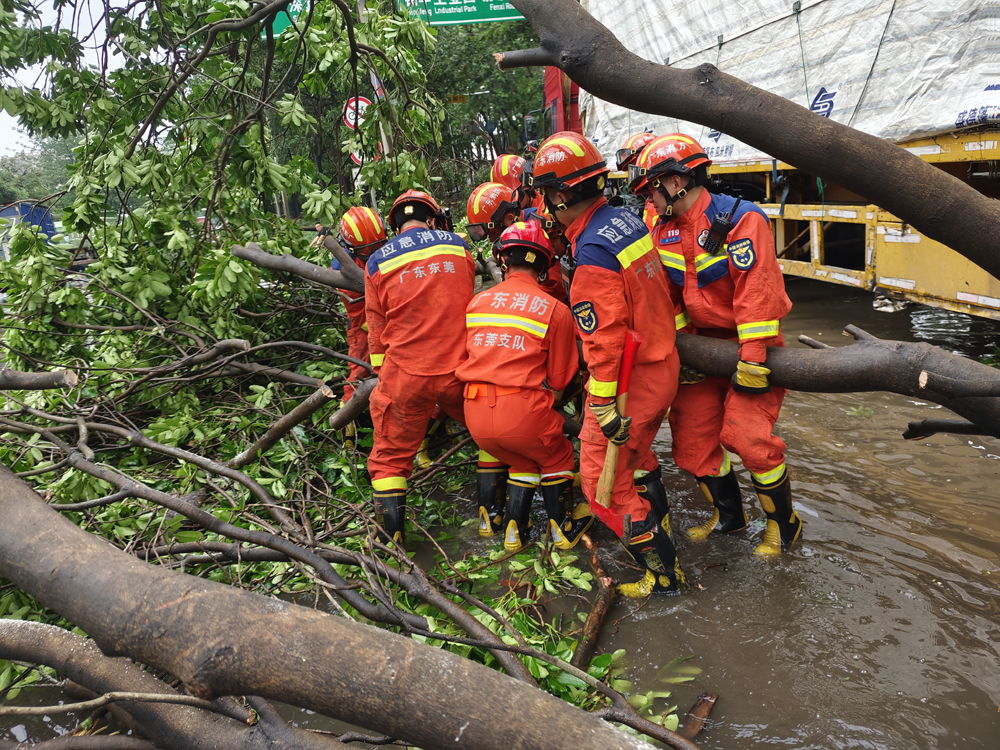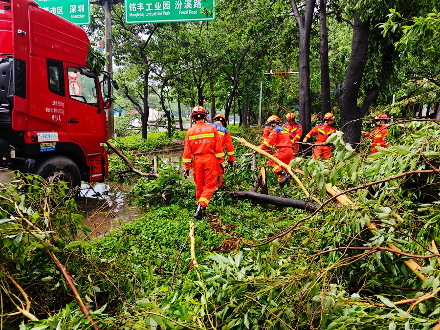 4月28日上午,东莞市气象台发布雷雨大风红色预警。受暴雨、大风等强对流天气影响,万江多处地方出现断枝落叶,严重影响市民出行,万江消防救援大队迅速行动,及时排危清理,保障道路通畅。