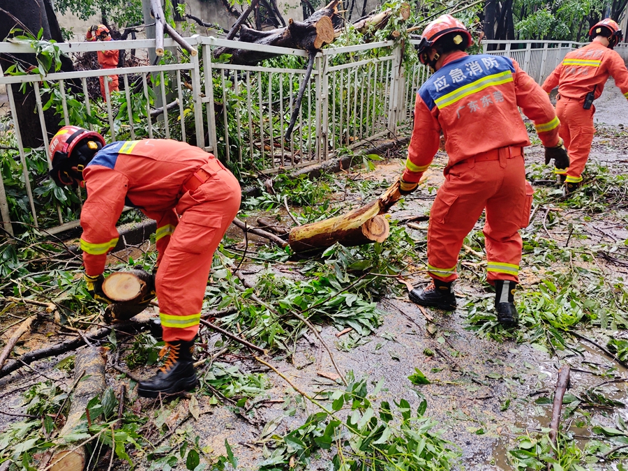 消防救援人员及时将倒地的树枝抬到安全位置,及时排除险情。
