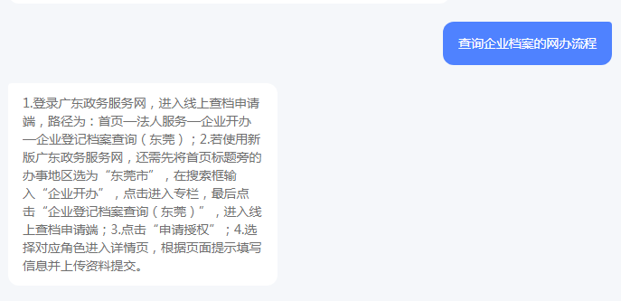 如咨询“查询企业档案的网办流程”,“小莞”则会回答:1.登录广东政务服务网,进入线上查档申请端,路径为:首页—法人服务—企业开办—企业登记档案查询(东莞);2.若使用新版广东政务服务网,还需先将首页标题旁的办事地区选为“东莞市”,在搜索框输入“企业开办”,点击进入专栏,最后点击“企业登记档案查询(东莞)”,进入线上查档申请端;3.点击“申请授权”;4.选择对应角色进入详情页,根据页面提示填写信息并上传资料提交。