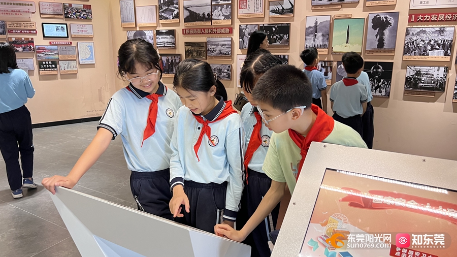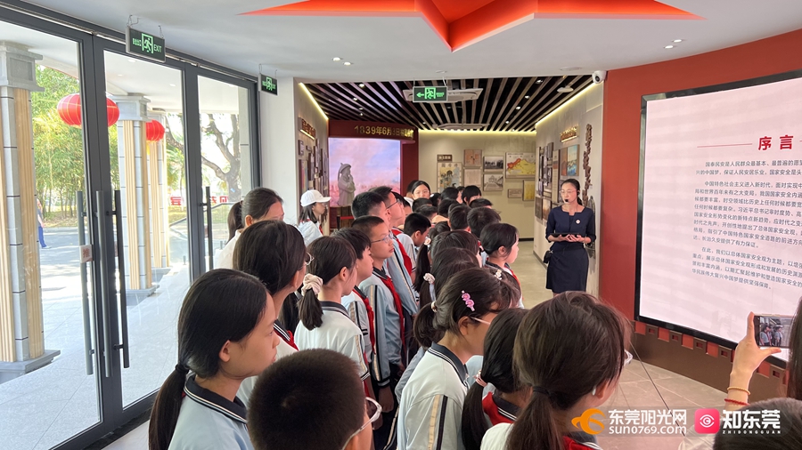 在展馆内,东莞师范学校附属小学的学生在讲解员的带领下,系统学习总体国家安全观涉及的20个重点领域,包括政治安全、军事安全、网络安全、生物安全等。展馆讲解员通过图文展板、互动设备、案例视频等多种形式,向同学们生动展示了国家安全的重要性。