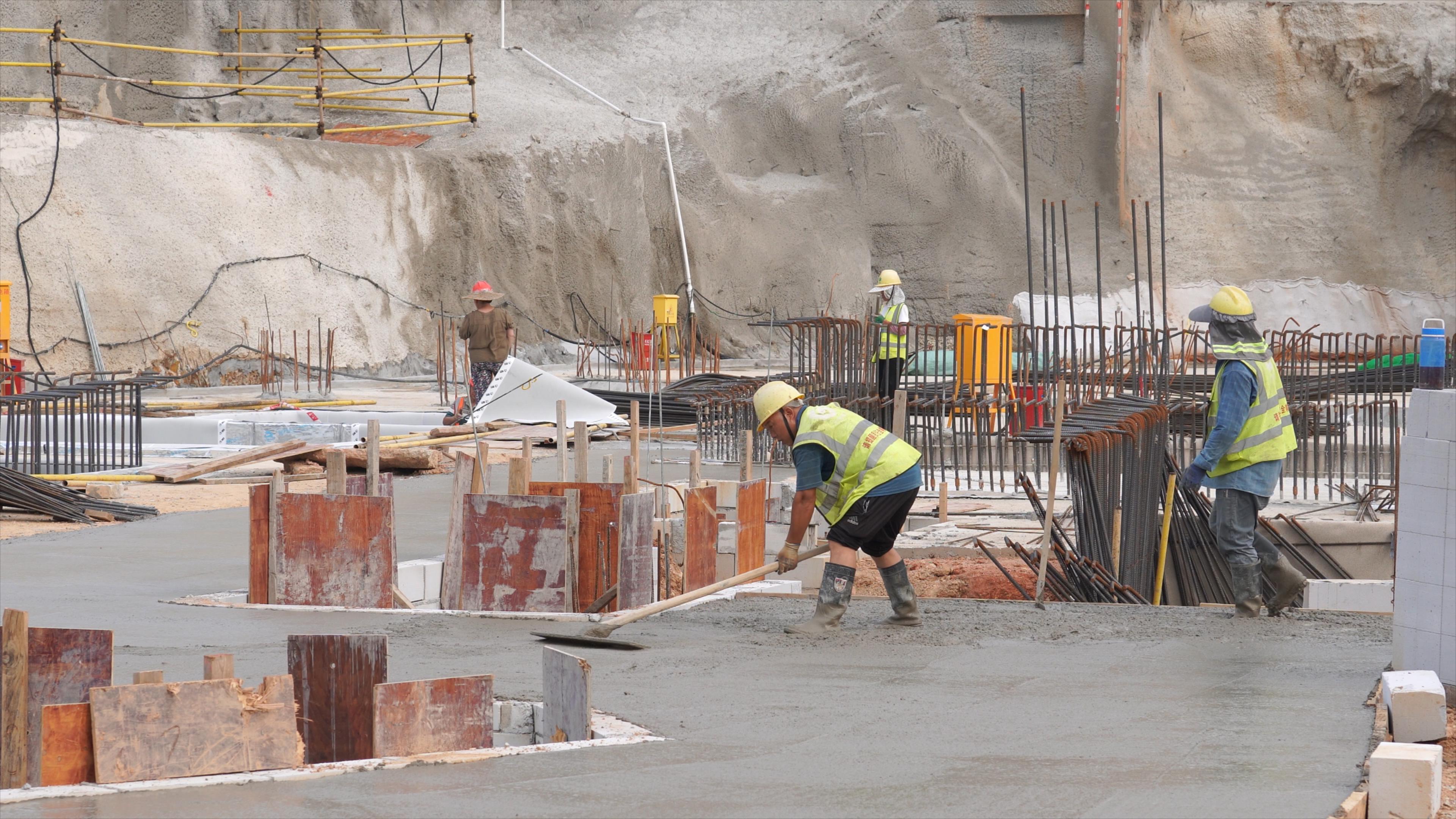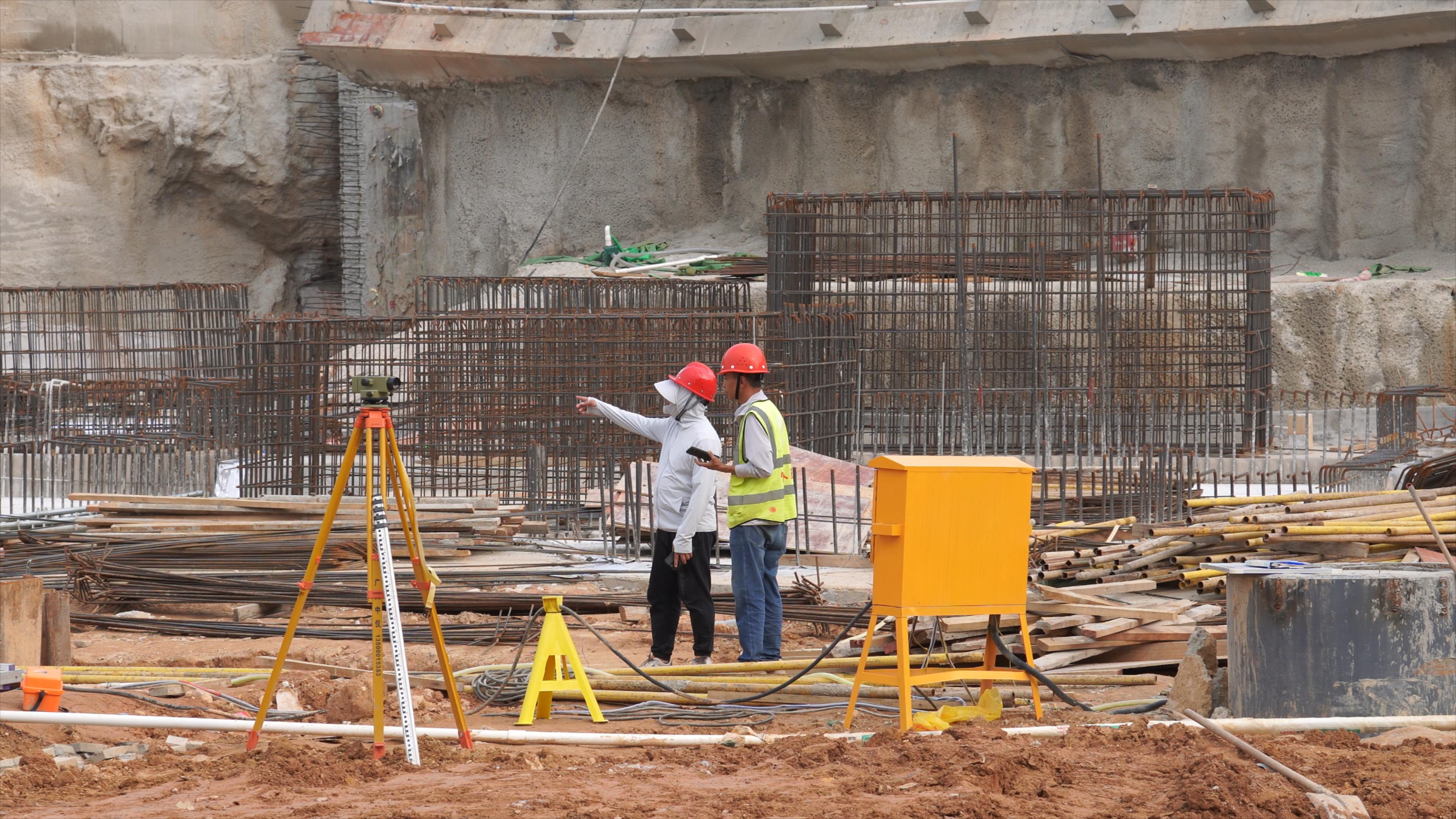 记者在施工现场看到,塔吊高耸,车辆络绎不绝。施工人员忙碌地进行绑扎钢筋、搬运土方等各道工序,繁忙而有序。
