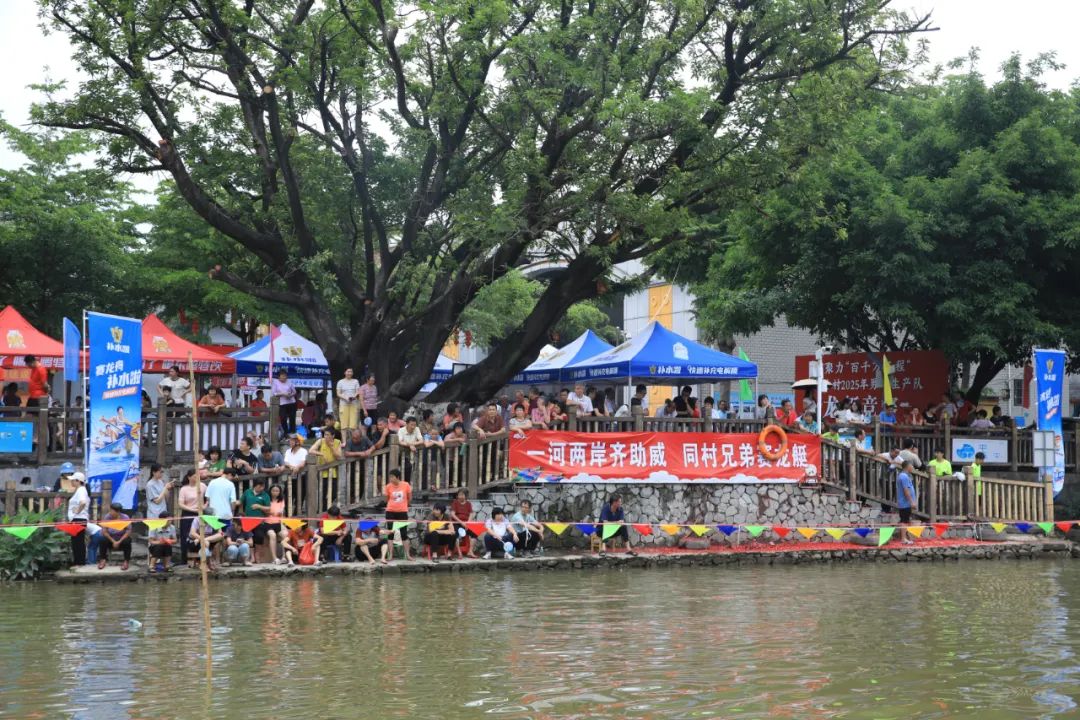 河岸两边围满了热情的观众,他们的欢呼声、加油声此起彼伏,现场气氛热烈非凡。“加油!14队冲啊!”“11队稳住节奏!”村民的助威声与锣鼓声交织,将比赛气氛推向高潮。