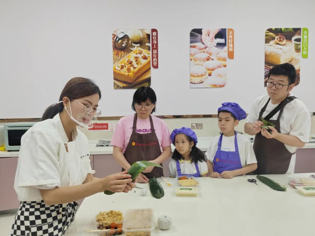 在市二宫的包粽子体验课上,老师详细讲解包粽子的技巧,展示折粽叶、装糯米、放馅料、扎绳子等一系列步骤。职工们围坐一起,认真学习,迫不及待动手尝试。尽管一开始手法生疏,糯米“调皮”散落,但在老师耐心指导和相互帮助下,大家逐渐掌握技巧,粽叶在手中翻转,一个个饱满的粽子成型。职工们在动手制作的过程中,感受传统文化的魅力,度过了一个充实而有意义的节日。