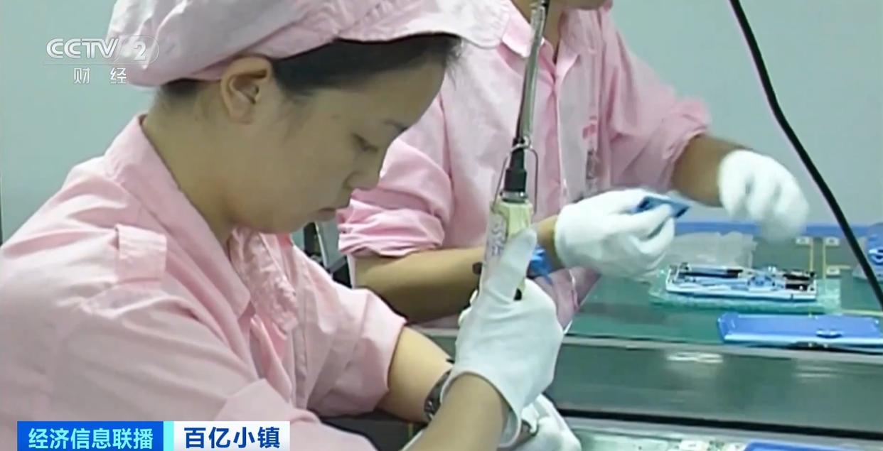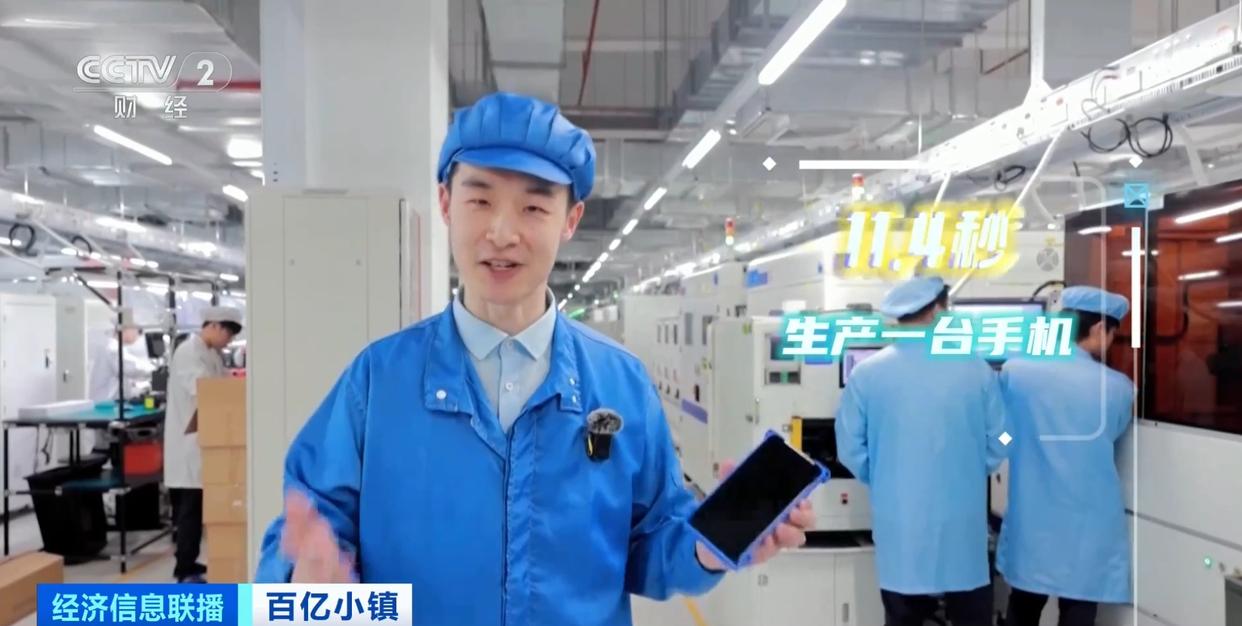 总台央视记者王宇:“在广东东莞长安镇的一条智能手机生产线,平均每11.4秒,就有1台手机从这里被生产下线。长安镇被称为中国手机产业第一镇,全球每8台手机中就有1台诞生于这里。而就在我说话的这一分钟里,又有195台手机诞生于长安镇。从一个面积不足80平方公里的沿海小镇,蜕变为一个GDP突破千亿元的制造业重镇,长安镇的“兴业密码”就藏在这一部部手机里。”
