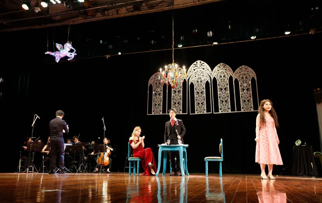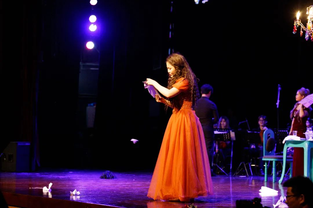 随着钟声响起,剧场内的灯光逐渐变暗,室内乐缓缓奏响,一个梦幻般的“童话法式府邸”呈现在观众面前。随后,包括少女劳蕾特、西尔维奥、县长以及维罗妮卡在内的演员陆续登场……演出中,演员们运用女高音、男高音、男女中音、童声重唱等多个声部唱响法国歌曲,瞬间将现场观众带入歌剧的故事情境中。