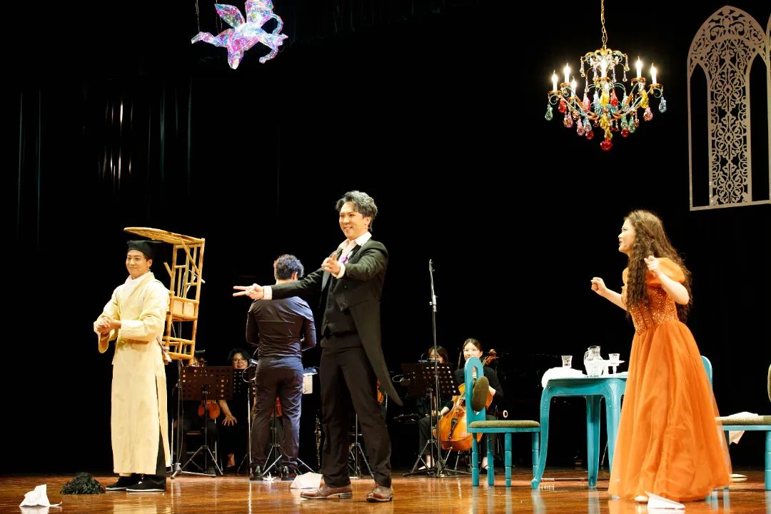 值得一提的是,全新改编的《神奇医生》在西方歌剧制作的基础上,巧妙融入了本土城市记忆。在梦境演绎中,经典人物形象宁采臣化身“神奇医生”闪现舞台时,瞬间将观众带入中国经典影视中,唤醒观众内心深处的情感共鸣。而“发生咩事”“中咗毒”“唔......死梗喽”等意料之外的粤语台词回荡在剧场内时,更引得现场观众忍俊不禁。另外,也有五指毛桃、鸡公榄等广东人熟知的中药材出现在歌剧现场,传统歌剧融入广东特色,为东莞观众了解本土文化提供了独特视角。