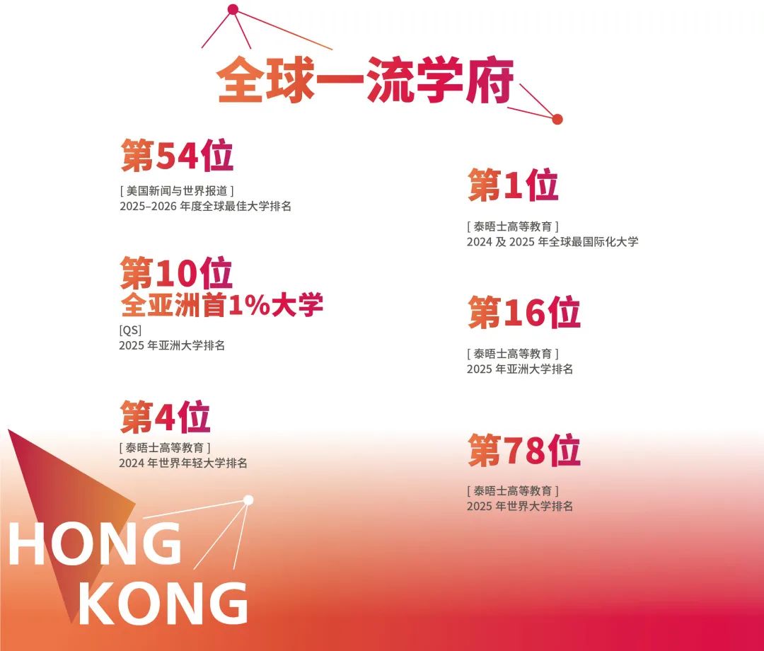 香港城市大学始终以创新精神专注于研究与专业教育两大领域,在国际高等教育舞台上有重大影响力。香港城市大学在2025-2026年度U.S. News & World Report 排名中位列全球第54位、亚洲第9位、香港第3位,在2024及2025年连续两年获泰晤士高等教育(THE)评为全球最国际化大学。