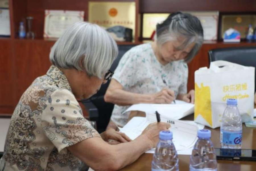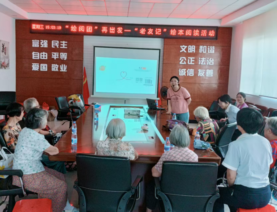 黄江旧村喜庆堂里,一位老爷爷在听完绘本故事《五岁老奶奶去钓鱼》后,分享了整整三页纸的社区工作旧时光;东城敬老院里,99岁的老奶奶在绘本《我等待……》的启发下,欣然在“人生档案”上写下了即兴创作的小诗《人生感悟》;长安敬老院的老爷爷被“绘阅团”成员讲的故事逗得合不拢嘴;南城第一幼儿园绘本馆内,祖孙同听绘本故事,露出同样期待和兴奋的眼神……这些温馨的画面,就像一缕缕清风,吹散了夏日的炎热,吹进了长者们的心田。