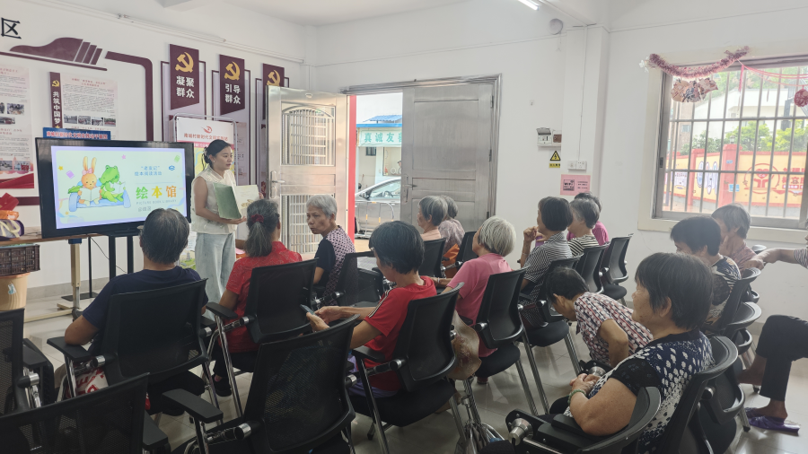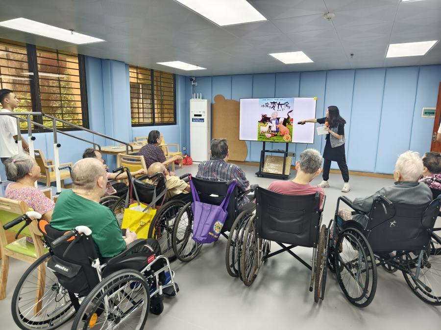 ▲长安绘本馆蔡娉云老师在长安敬老院开展绘本阅读活动。