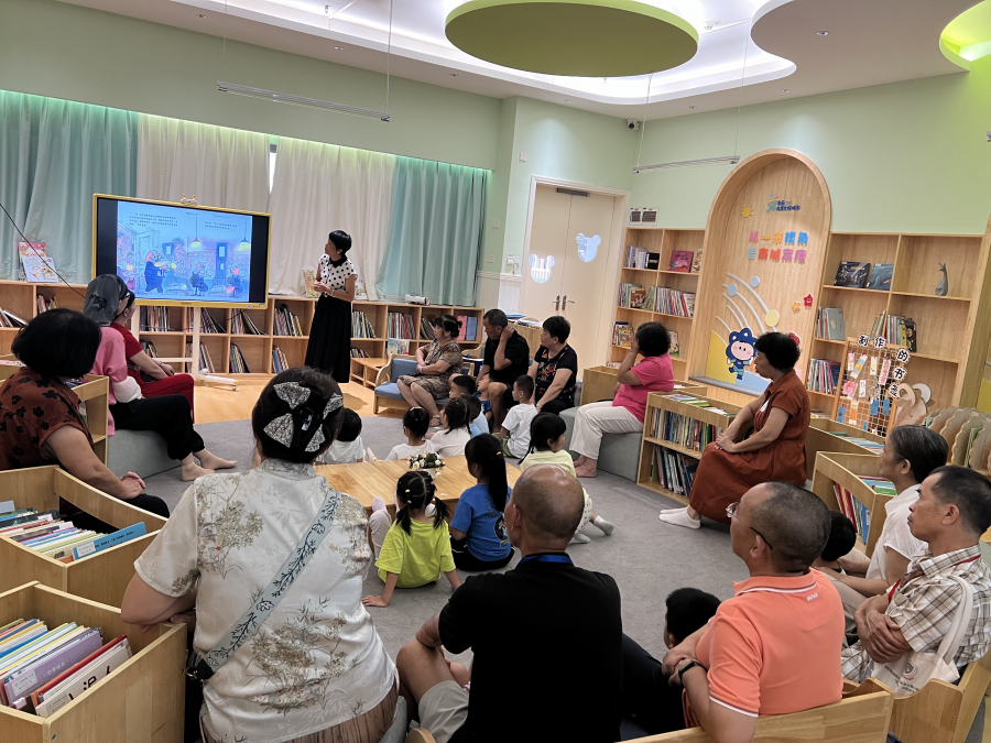 ▲厚街绘本馆张凤银老师在厚街镇卓越维港幼儿园开展祖孙共读绘本活动。