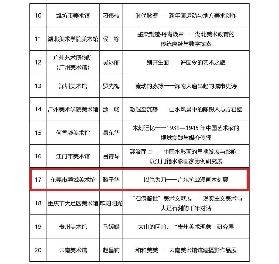 近日,文化和旅游部办公厅公布《2025年全国美术馆青年策展人扶持计划入选项目名单》全国范围共有10个项目入选,20个项目提名。其中,东莞市莞城美术馆申报的“以笔为刀——广东抗战漫画木刻展”(策展人:黎子华)成功获选提名项目。