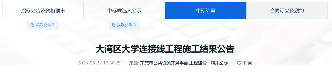 近日,广东省公共资源交易平台公布了大湾区大学连接线工程施工招标结果。中交第二航务工程局有限公司以427,578,986元成功中标,工期1096天。