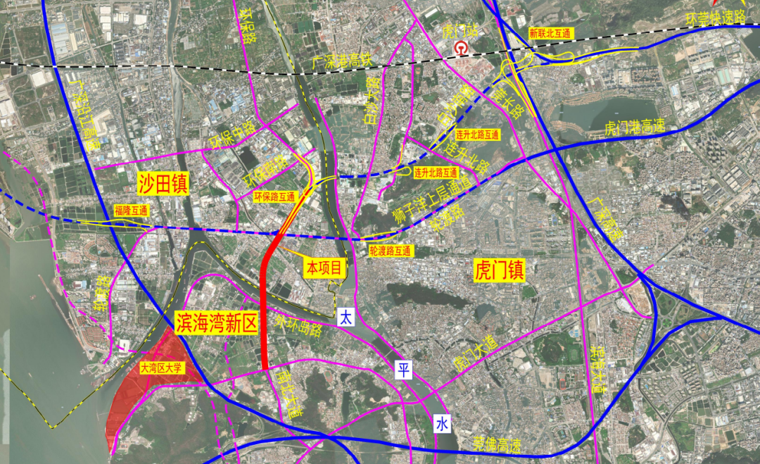大湾区大学连接线——这条跨太平水道连接虎门威远岛与沙田镇,并与白沙南路顺接、直通虎门高铁站的道路,即将进入施工阶段。