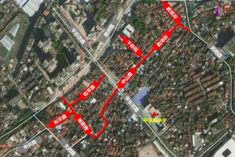 中山路、和平路、维新路、教场街围蔽进行施工,围蔽至店铺柱子,两侧店铺门口走廊可行人通行,车辆无法通行。围蔽天数约120天,2025年7月15日至2025年11月14日。千祥街及部分教场街由于巷道太窄采用临时围蔽进行施工。
