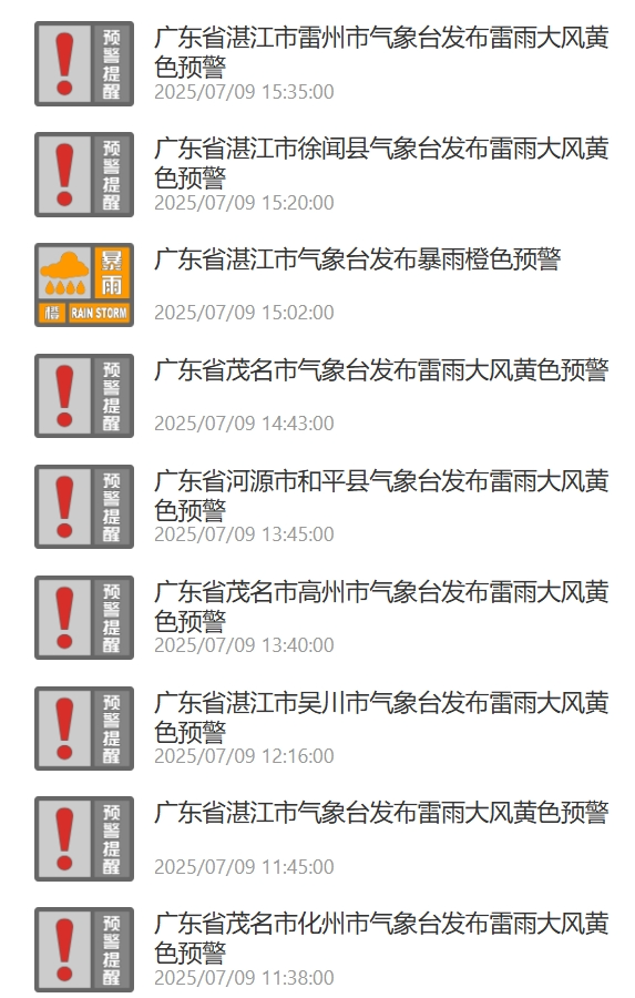 截至发稿前,广东多地发布雷雨大风预警、暴雨预警。